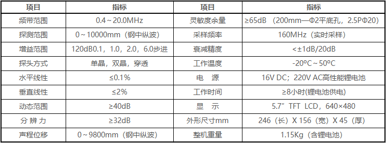 - 缺陷回波參數(shù)(距離、垂直、水平、波幅、dB或當(dāng)量孔徑值)實(shí)時(shí)顯示;多次波探測缺陷的實(shí)際深度可直接顯示。
