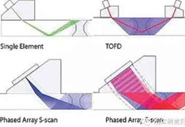 用相控陣探頭對焊縫進行檢測時,無需像普通單探頭那樣在焊縫兩側頻繁地來回前后左右移動,而相控陣探頭沿著焊縫長度方向平行于焊縫進行直線掃查,對焊接接頭進行全體積檢測。該掃查方式可借助于裝有陣列探頭的機械掃查器沿著精確定位的軌道滑動完成,也采用手動方式完成,可實現快速檢測,檢測效率非常高。
