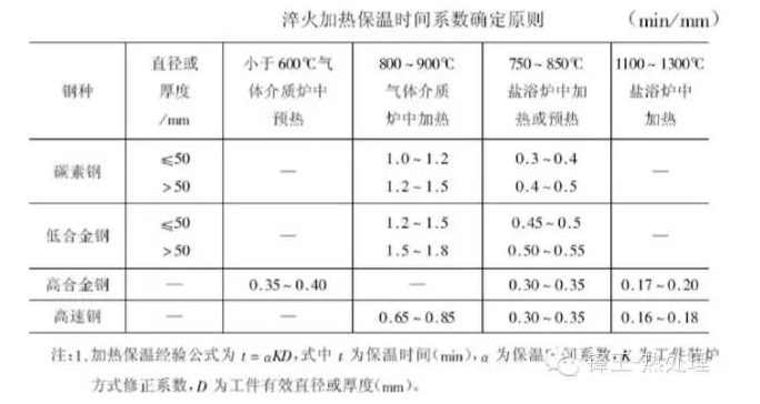 傳統的碳素鋼淬火加熱時間的計算公式:T=K?αD